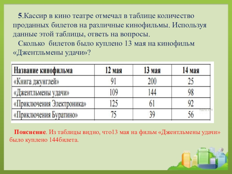 Пояснение. Из таблицы видно, что13 мая на фильм «Джентльмены удачи» было куплено 144билета.