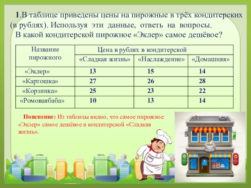 Пояснение: Из таблицы видно, что самое пирожное «Эклер» самое дешёвое в кондитерской «Сладкая жизнь».