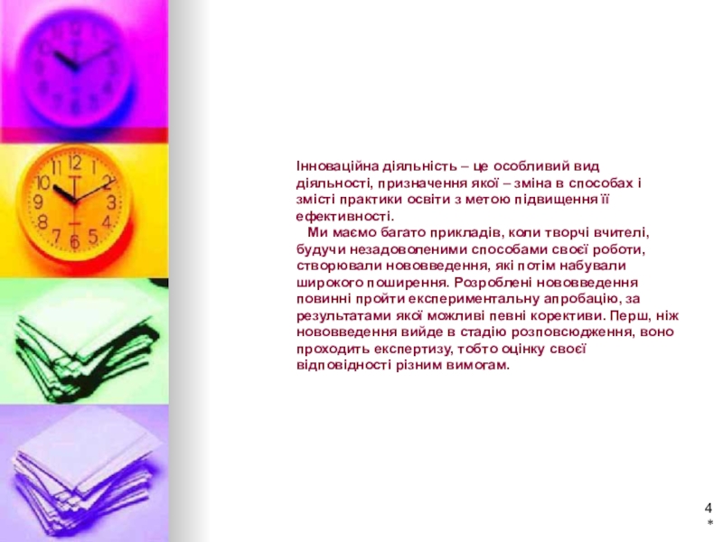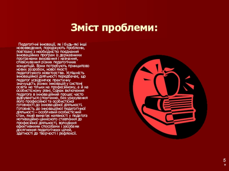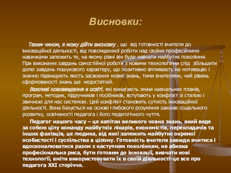 Важливі нововведення в освіті, які вимагають зміни навчальних планів, програм, методик, підручників і посібників, вступають у конфлікт зі сталою і звичною для нас системою. Цей конфлікт становить сутність інноваційної діяльності. Вона базується на основі глибокого розуміння законів соціального розвитку, освіченості педагога і його педагогічного чуття.