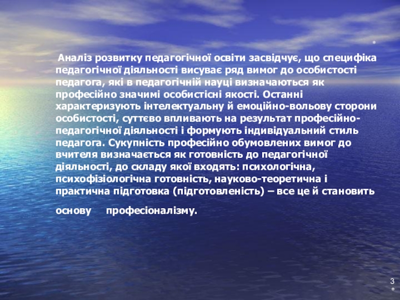 педагогічної діяльності висуває ряд вимог до особистості педагога, які в педагогічній науці визначаються як професійно значимі особистісні якості. Останні характеризують інтелектуальну й емоційно-вольову сторони особистості, суттєво впливають на результат професійно-педагогічної діяльності і формують індивідуальний стиль педагога. Сукупність професійно обумовлених вимог до вчителя визначається як готовність до педагогічної діяльності, до складу якої входять: психологічна, психофізіологічна готовність, науково-теоретична і практична підготовка (підготовленість) – все це й становить основу професіоналізму.