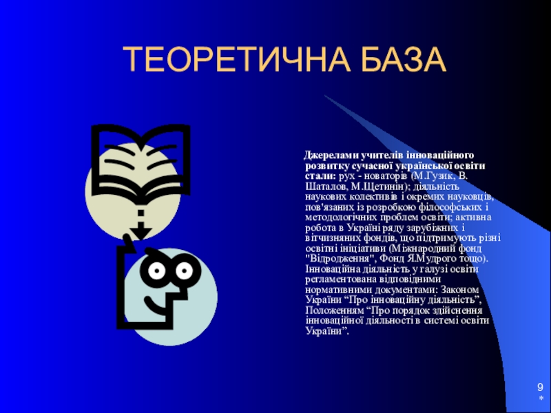 освіти стали: рух - новаторів (М.Гузик, В.Шаталов, М.Щетинін); діяльність наукових колективів і окремих науковців, пов'язаних із розробкою філософських і методологічних проблем освіти; активна робота в Україні ряду зарубіжних і вітчизняних фондів, що підтримують різні освітні ініціативи (Міжнародний фонд "Відродження", Фонд Я.Мудрого тощо). Інноваційна діяльність у галузі освіти регламентована відповідними нормативними документами: Законом України “Про інноваційну діяльність”, Положенням “Про порядок здійснення інноваційної діяльності в системі освіти України”.