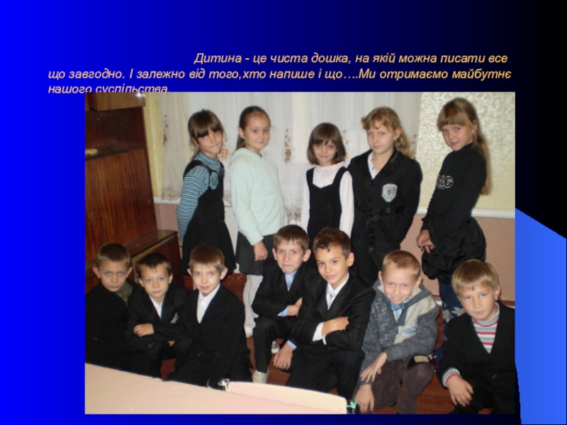 Дитина - це чиста дошка, на якій можна писати все що завгодно. І залежно від того,хто напише і що….Ми отримаємо майбутнє нашого суспільства.