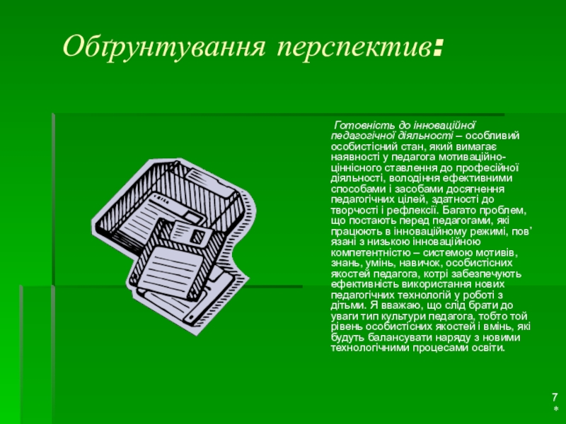 – особливий особистісний стан, який вимагає наявності у педагога мотиваційно-ціннісного ставлення до професійної діяльності, володіння ефективними способами і засобами досягнення педагогічних цілей, здатності до творчості і рефлексії. Багато проблем, що постають перед педагогами, які працюють в інноваційному режимі, пов’язані з низькою інноваційною компетентністю – системою мотивів, знань, умінь, навичок, особистісних якостей педагога, котрі забезпечують ефективність використання нових педагогічних технологій у роботі з дітьми. Я вважаю, що слід брати до уваги тип культури педагога, тобто той рівень особистісних якостей і вмінь, які будуть балансувати наряду з новими технологічними процесами освіти.