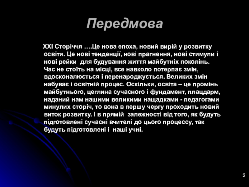 освіти. Це нові тенденції, нові прагнення, нові стимули і нові рейки для будування життя майбутніх поколінь. Час не стоїть на місці, все навколо потерпає змін, вдосконалюється і перенароджується. Великих змін набуває і освітній процес. Оскільки, освіта – це промінь майбутнього, цеглина сучасного і фундамент, плацдарм, наданий нам нашими великими нащадками - педагогами минулих сторіч, то вона в першу чергу проходить новий виток розвитку. І в прямій залежності від того, як будуть підготовлені сучасні вчителі до цього процессу, так будуть підготовлені і наші учні.