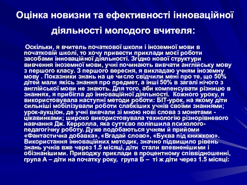 Оскільки, я вчитель початкової школи і іноземної мови в початковій школі, то хочу привести приклади моєї роботи засобами інноваційної діяльності. Згідно нової структури вивчення іноземної мови, учні починають вивчати англійську мову з першого класу. З першого вересня, я викладаю учням іноземну мову . Показники знань на це число свідчили мені про те, що 50% дітей мали якісь знання про предмет, а інші 50% в загалі нічого з англійської мови не знають. Для того, аби компенсувати різницю в знаннях, я прибігла до інноваційної діяльності. Кожного уроку, я використовувала наступні методи роботи: БІТ-урок, на якому діти сильніші мобілізували роботи слабкіших учнів своїми знаннями; урок-аукціон, де учні вивчали зі мною нові слова з монетами - цікавинками; широко використовувала технологію різнорівневого навчання Дж. Керролла, яка суттєво поліпшила психолого-педагогічну роботу. Дуже подобаються учням й прийоми «Фантастична добавка», «Вгадай слово», «Буква під книжкою». Використання інноваційних методик, значно підвищило рівень знань учнів вже через 1.5 місяці, діти стали впевненішими і обізнанішими. Приводжу приклади в процентному співвідношенні, група А – діти на початку року, група Б – ті ж діти через 1.5 місяці: