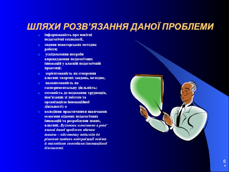 володіння практичними навичками освоєння відомих педагогічних інновацій та розроблення нових, власних. Вузловим моментом в розв’язанні даної проблеми вбачаю також – підготовку педагогів до рішення завдань модернізації освіти й оволодіння способами інноваційної діяльності.