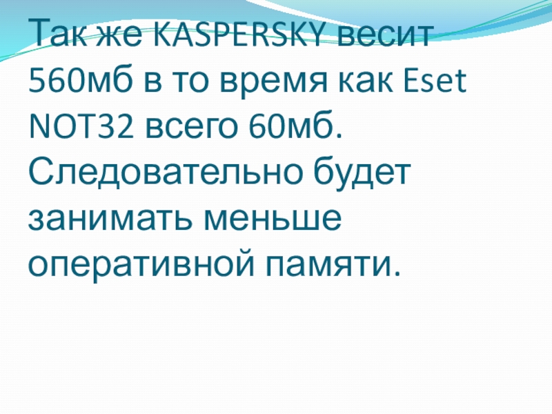 Слайд 12Так же KASPERSKY весит 560мб в то время как Eset NOT32