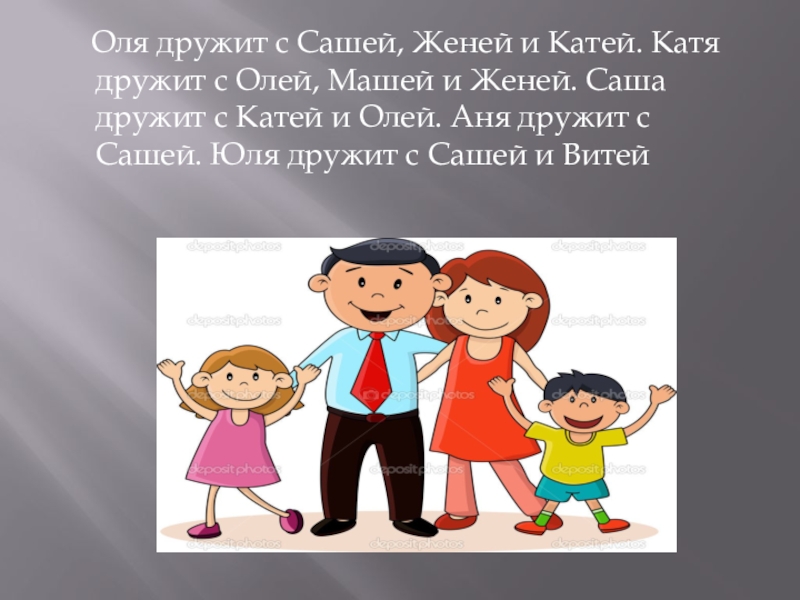 Слайд 4 Оля дружит с Сашей, Женей и Катей. Катя дружит