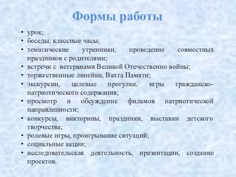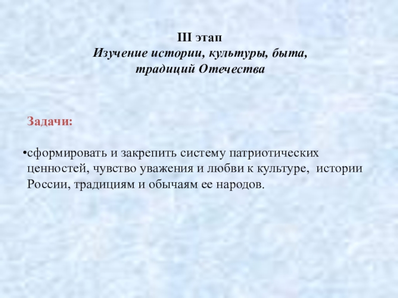 сформировать и закрепить систему патриотических ценностей, чувство уважения и любви к культуре, истории России, традициям и обычаям ее народов.