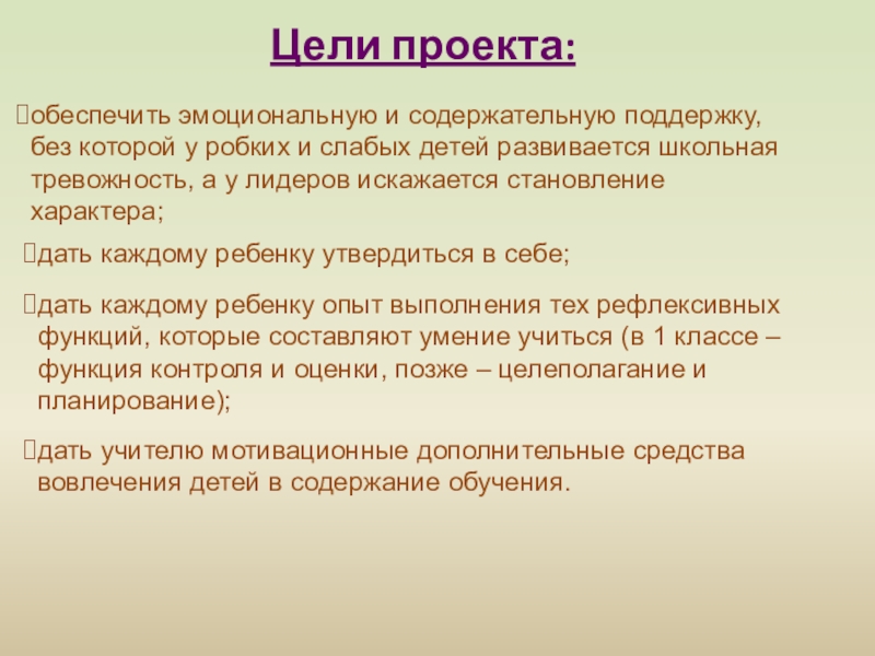дать каждому ребенку опыт выполнения тех рефлексивных функций, которые составляют умение учиться (в 1 классе – функция контроля и оценки, позже – целеполагание и планирование);