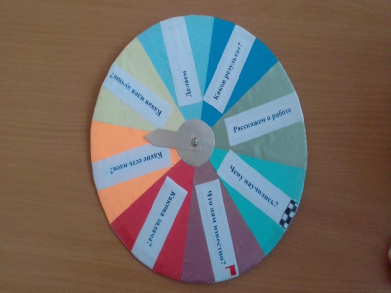 Как это выглядит практически? Разноцветный круг со встроенной стрелкой. По этому кругу шаг за шагом перемещаются в процессе работы над определенной темой.