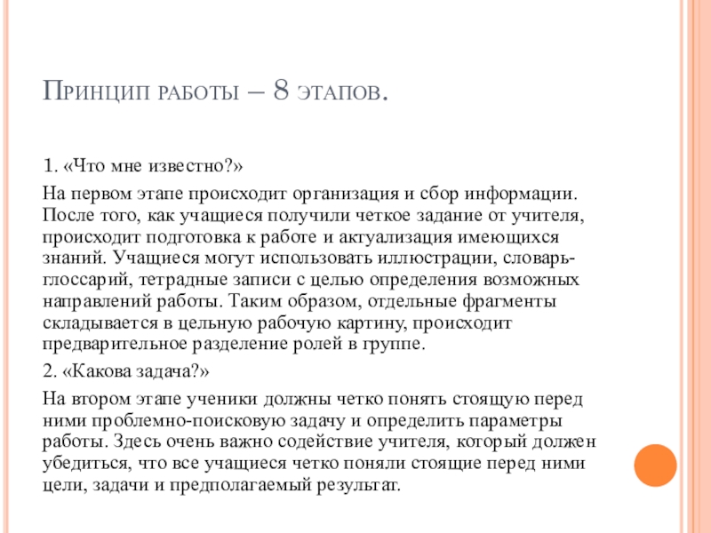 происходит организация и сбор информации. После того, как учащиеся получили четкое задание от учителя, происходит подготовка к работе и актуализация имеющихся знаний. Учащиеся могут использовать иллюстрации, словарь-глоссарий, тетрадные записи с целью определения возможных направлений работы. Таким образом, отдельные фрагменты складывается в цельную рабочую картину, происходит предварительное разделение ролей в группе.