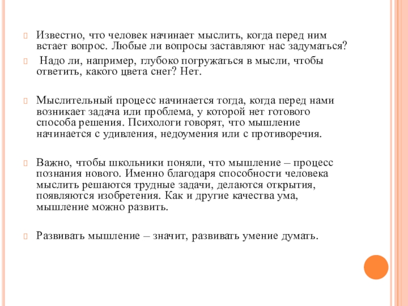 Слайд 11Известно, что человек начинает мыслить, когда перед ним встает вопрос. Любые