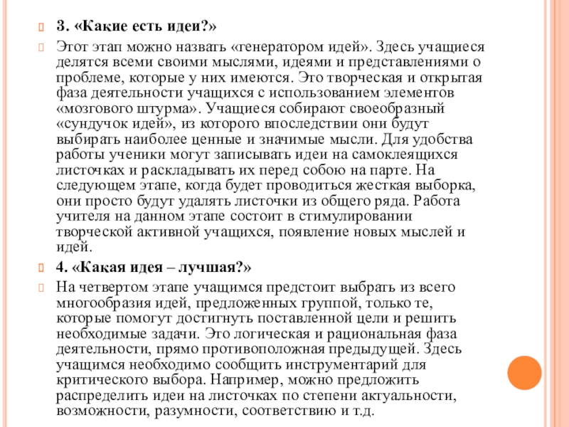 учащиеся делятся всеми своими мыслями, идеями и представлениями о проблеме, которые у них имеются. Это творческая и открытая фаза деятельности учащихся с использованием элементов «мозгового штурма». Учащиеся собирают своеобразный «сундучок идей», из которого впоследствии они будут выбирать наиболее ценные и значимые мысли. Для удобства работы ученики могут записывать идеи на самоклеящихся листочках и раскладывать их перед собою на парте. На следующем этапе, когда будет проводиться жесткая выборка, они просто будут удалять листочки из общего ряда. Работа учителя на данном этапе состоит в стимулировании творческой активной учащихся, появление новых мыслей и идей.