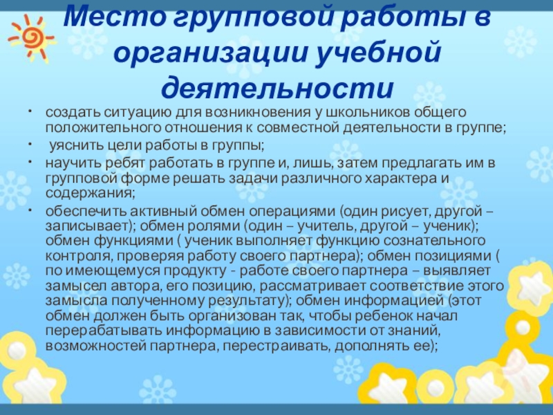 - учесть, что групповая работа