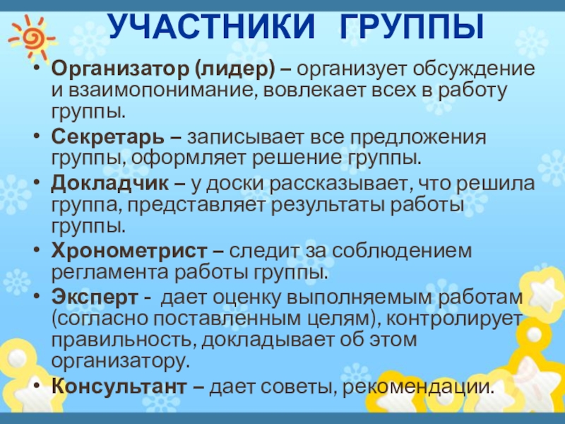 Секретарь – записывает все предложения группы, оформляет решение группы.