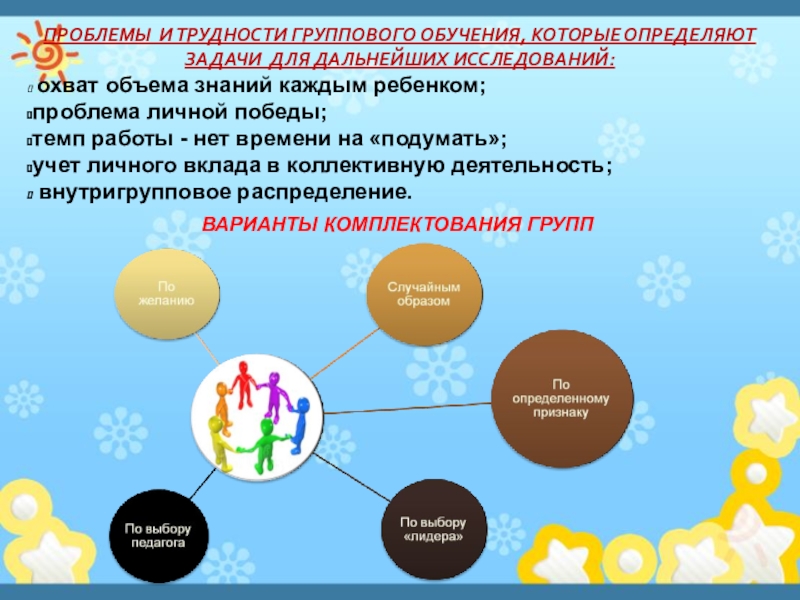Слайд 25ПРОБЛЕМЫ И ТРУДНОСТИ ГРУППОВОГО ОБУЧЕНИЯ, КОТОРЫЕ ОПРЕДЕЛЯЮТ ЗАДАЧИ ДЛЯ ДАЛЬНЕЙШИХ ИССЛЕДОВАНИЙ: