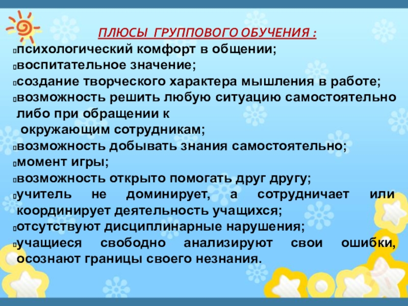 Слайд 24ПЛЮСЫ ГРУППОВОГО ОБУЧЕНИЯ :