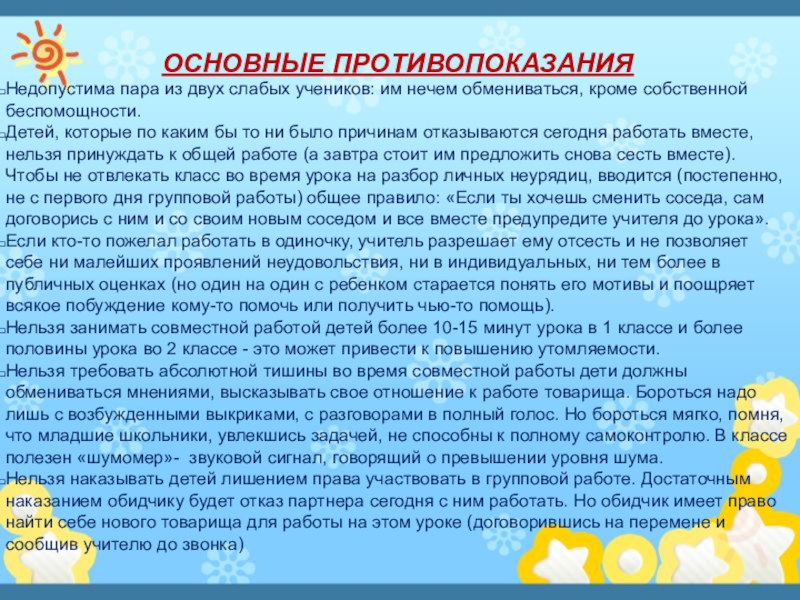 Нельзя занимать совместной работой детей более 10-15 минут урока в 1 классе и более половины урока во 2 классе - это может привести к повышению утомляемости.