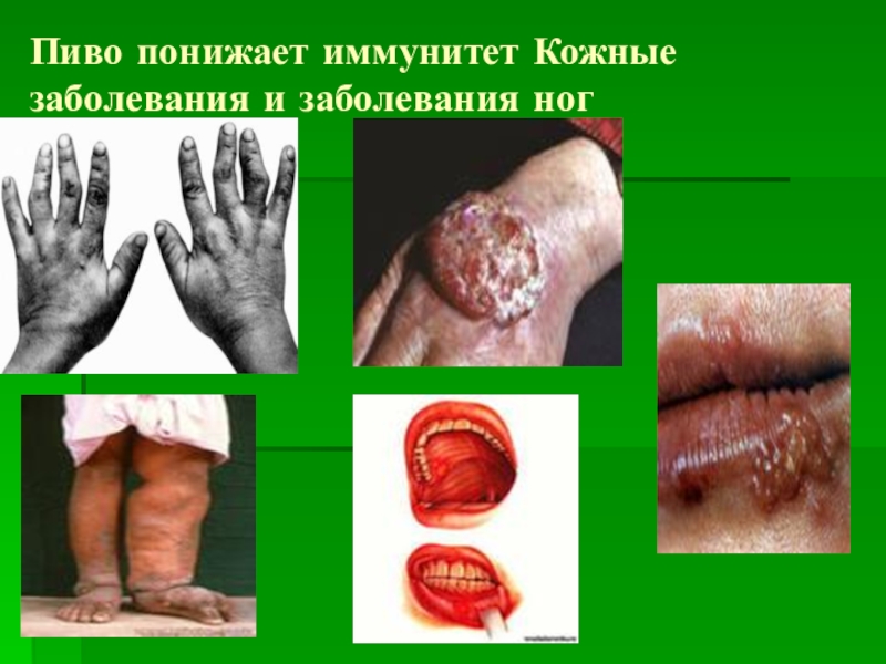 Слайд 13Пиво понижает иммунитет Кожные заболевания и заболевания ног