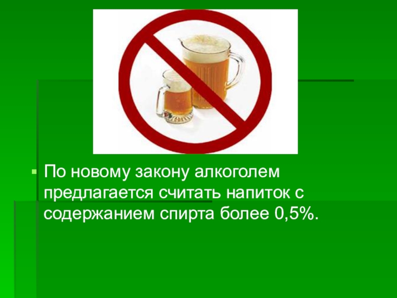 Слайд 33По новому закону алкоголем предлагается считать напиток с содержанием спирта более