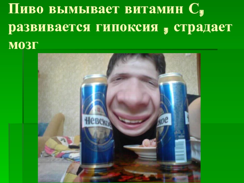 Слайд 10Пиво вымывает витамин С, развивается гипоксия , страдает мозг