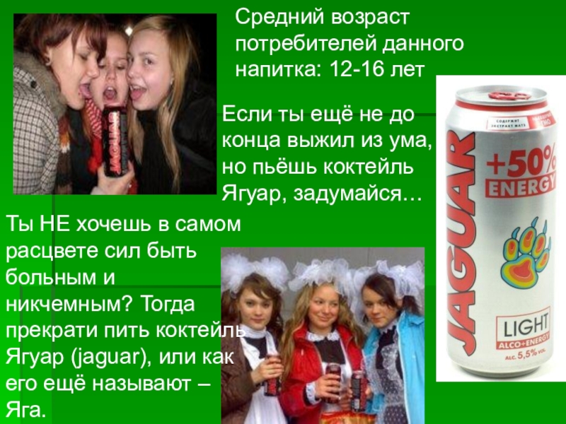 Ты НЕ хочешь в самом расцвете сил быть больным и никчемным? Тогда прекрати пить коктейль Ягуар (jaguar), или как его ещё называют – Яга.
