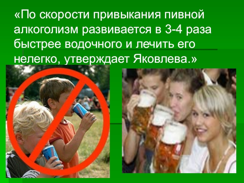 Слайд 26«По скорости привыкания пивной алкоголизм развивается в 3-4 раза быстрее водочного