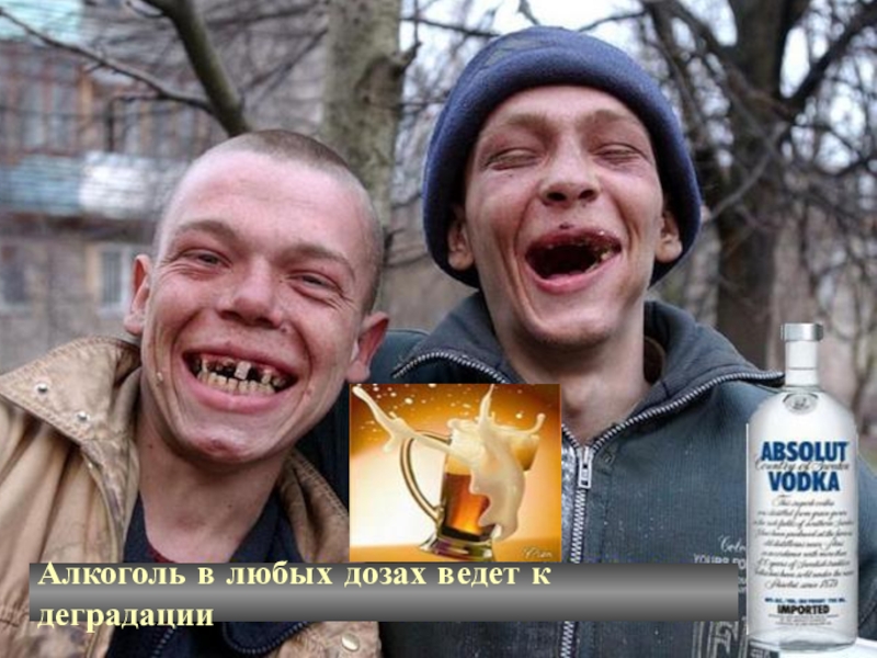 Слайд 12Алкоголь в любых дозах ведет к деградации