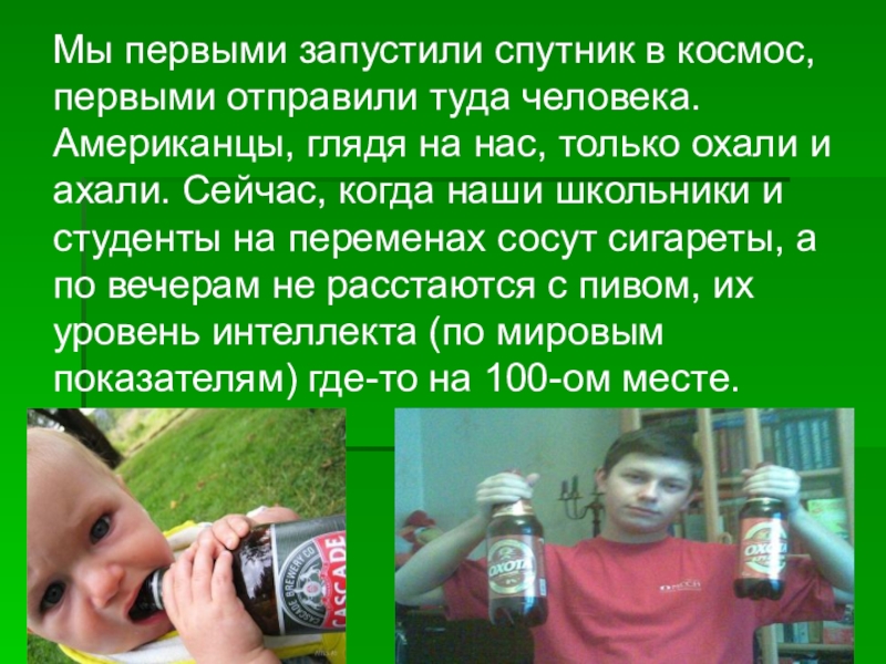 глядя на нас, только охали и ахали. Сейчас, когда наши школьники и студенты на переменах сосут сигареты, а по вечерам не расстаются с пивом, их уровень интеллекта (по мировым показателям) где-то на 100-ом месте.