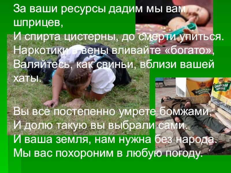 Слайд 31За ваши ресурсы дадим мы вам шприцев,
