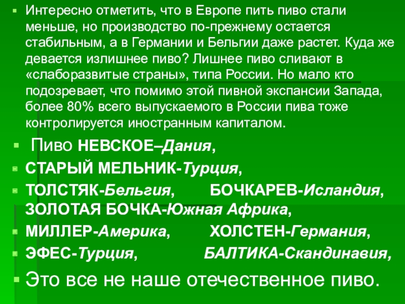 по-прежнему остается стабильным, а в Германии и Бельгии даже растет. Куда же девается излишнее пиво? Лишнее пиво сливают в «слаборазвитые страны», типа России. Но мало кто подозревает, что помимо этой пивной экспансии Запада, более 80% всего выпускаемого в России пива тоже контролируется иностранным капиталом.