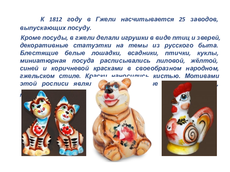 Кроме посуды, в гжели делали игрушки в виде птиц и зверей, декоративные статуэтки на темы из русского быта. Блестящие белые лошадки, всадники, птички, куклы, миниатюрная посуда расписывались лиловой, жёлтой, синей и коричневой красками в своеобразном народном, гжельском стиле. Краски наносились кистью. Мотивами этой росписи являлись декоративные цветы, листья, травы.