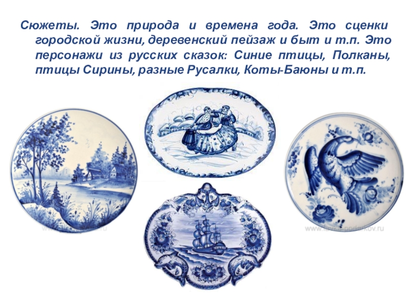 Слайд 14Многие работы гжели неповторимы и сюжет зависит именно от мастера и