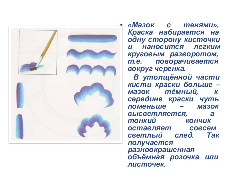 Слайд 20«Мазок с тенями». Краска набирается на одну сторону кисточки и наносится