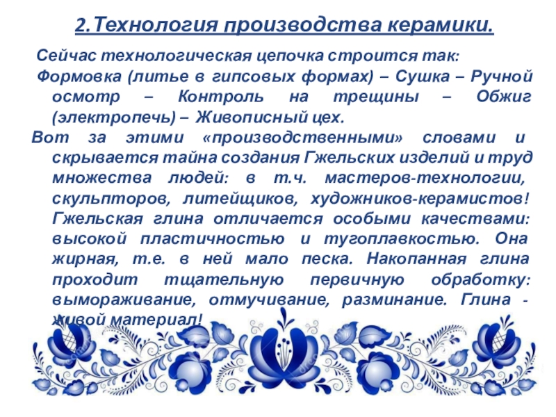 Вот за этими «производственными» словами и скрывается тайна создания Гжельских изделий и труд множества людей: в т.ч. мастеров-технологии, скульпторов, литейщиков, художников-керамистов! Гжельская глина отличается особыми качествами: высокой пластичностью и тугоплавкостью. Она жирная, т.е. в ней мало песка. Накопанная глина проходит тщательную первичную обработку: вымораживание, отмучивание, разминание. Глина - живой материал!