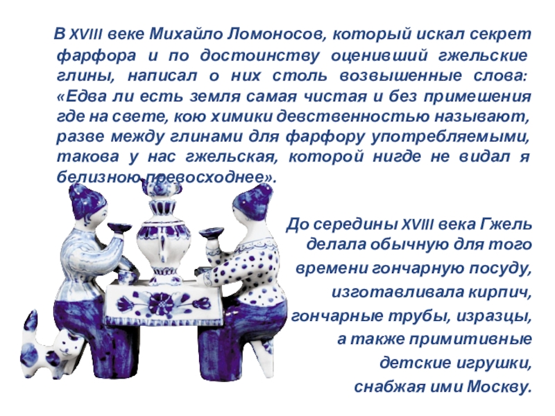 по достоинству оценивший гжельские глины, написал о них столь возвышенные слова: «Едва ли есть земля самая чистая и без примешения где на свете, кою химики девственностью называют, разве между глинами для фарфору употребляемыми, такова у нас гжельская, которой нигде не видал я белизною превосходнее».
