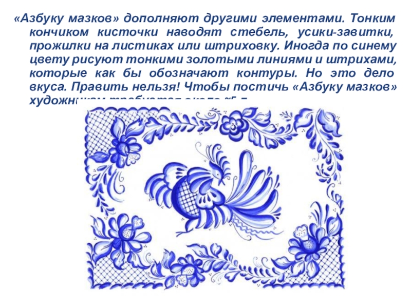 прожилки на листиках или штриховку. Иногда по синему цвету рисуют тонкими золотыми линиями и штрихами, которые как бы обозначают контуры. Но это дело вкуса. Править нельзя! Чтобы постичь «Азбуку мазков» художникам требуется около ~5 л.