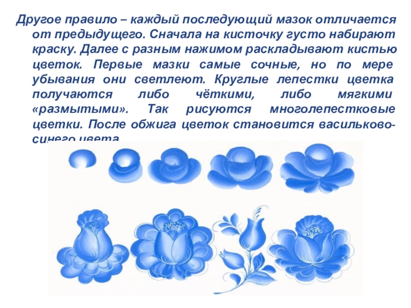 кисточку густо набирают краску. Далее с разным нажимом раскладывают кистью цветок. Первые мазки самые сочные, но по мере убывания они светлеют. Круглые лепестки цветка получаются либо чёткими, либо мягкими «размытыми». Так рисуются многолепестковые цветки. После обжига цветок становится васильково-синего цвета.