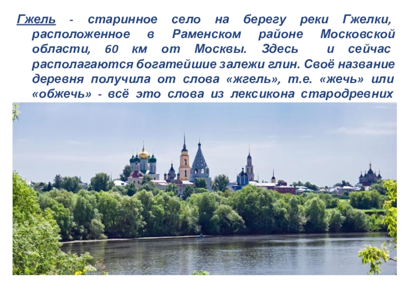 Слайд 8Гжель - старинное село на берегу реки Гжелки, расположенное в Раменском