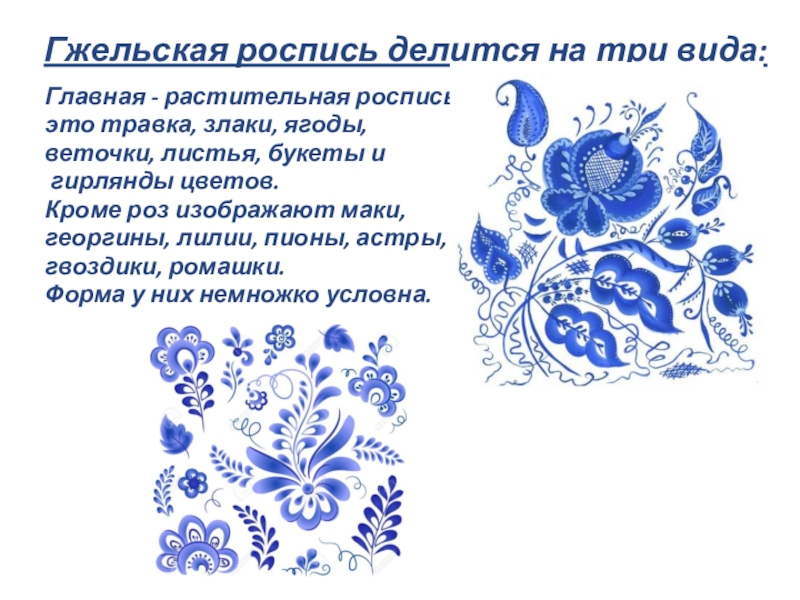 Слайд 15 Гжельская роспись делится на три вида: