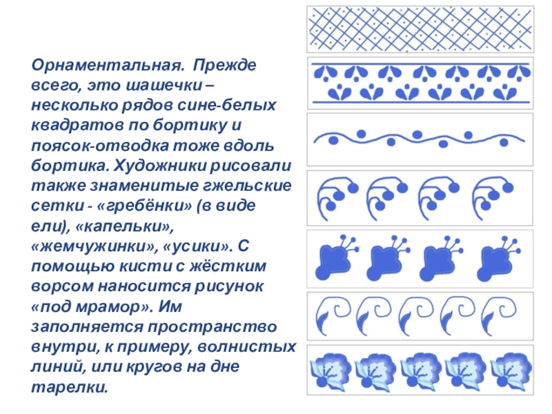 Слайд 16Орнаментальная. Прежде всего, это шашечки – несколько рядов сине-белых квадратов по