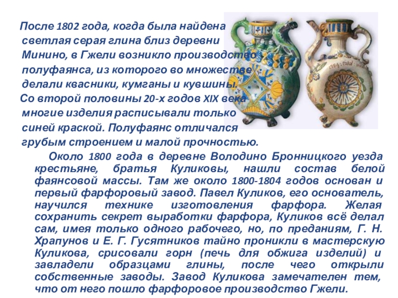 достижений гжельского керамического искусства во всех его отраслях. Стремясь получить тонкий фаянс и фарфор, владельцы производств постоянно совершенствовали состав белой массы.