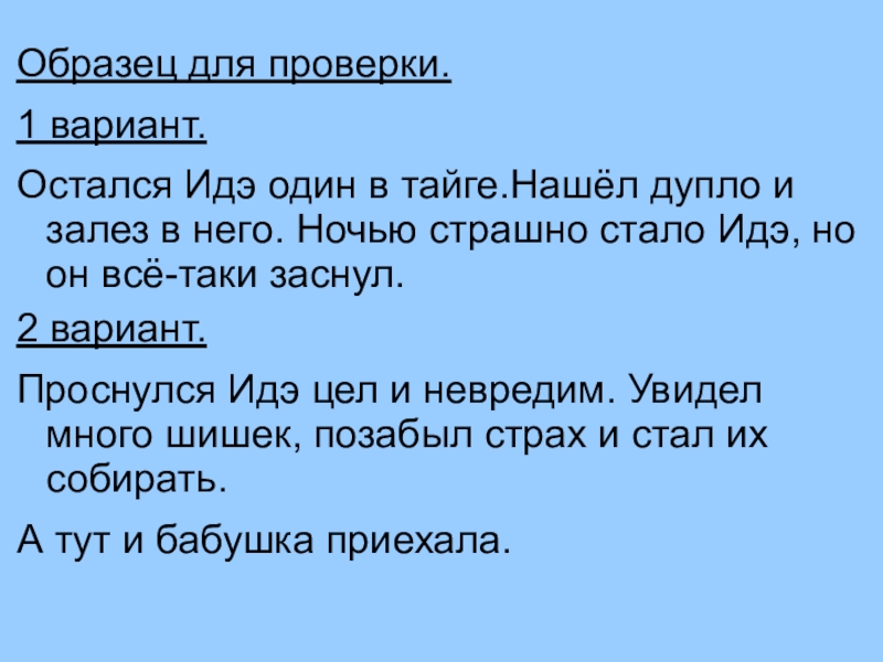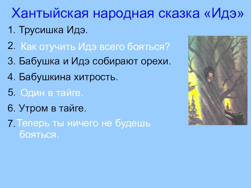 Остался Идэ один в тайге.Нашёл дупло и залез в него. Ночью страшно стало Идэ, но он всё-таки заснул.