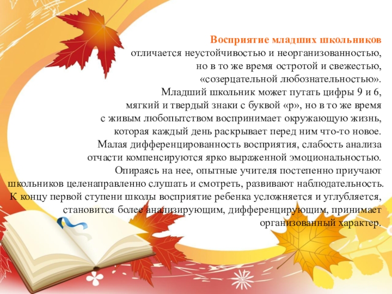К концу первой ступени школы восприятие ребенка усложняется и углубляется,