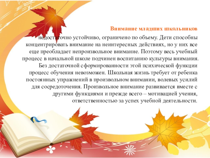 по объему. Дети способны концентрировать внимание на неинтересных действиях, но у них все еще преобладает непроизвольное внимание. Поэтому весь учебный процесс в начальной школе подчинен воспитанию культуры внимания. Без достаточной сформированности этой психической функции процесс обучения невозможен. Школьная жизнь требует от ребенка постоянных упражнений в произвольном внимании, волевых усилий для сосредоточения. Произвольное внимание развивается вместе с другими функциями и прежде всего – мотивацией учения, ответственностью за успех учебной деятельности.