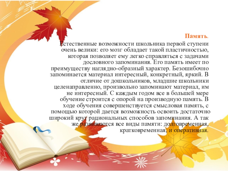 мозг обладает такой пластичностью, которая позволяет ему легко справляться с задачами дословного запоминания. Его память имеет по преимуществу наглядно-образный характер. Безошибочно запоминается материал интересный, конкретный, яркий. В отличие от дошкольников, младшие школьники целенаправленно, произвольно запоминают материал, им не интересный. С каждым годом все в большей мере обучение строится с опорой на производную память. В ходе обучения совершенствуется смысловая память, с помощью которой дается возможность освоить достаточно широкий круг рациональных способов запоминания. А так же развиваются все виды памяти: долговременная, кратковременная, и оперативная.