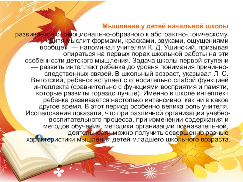 абстрактно-логическому. «Дитя мыслит формами, красками, звуками, ощущениями вообще», — напоминал учителям К. Д. Ушинский, призывая опираться на первых порах школьной работы на эти особенности детского мышления. Задача школы первой ступени — развить интеллект ребенка до уровня понимания причинно-следственных связей. В школьный возраст, указывал Л. С. Выготский, ребенок вступает с относительно слабой функцией интеллекта (сравнительно с функциями восприятия и памяти, которые развиты гораздо лучше). Именно в школе интеллект ребенка развивается настолько интенсивно, как ни в какое другое время. В этот период особенно велика роль учителя. Исследования показали, что при различной организации учебно-воспитательного процесса, при изменении содержания и методов обучения, методики организации познавательной, деятельности можно получить совершенно разные характеристики мышления детей младшего школьного возраста.