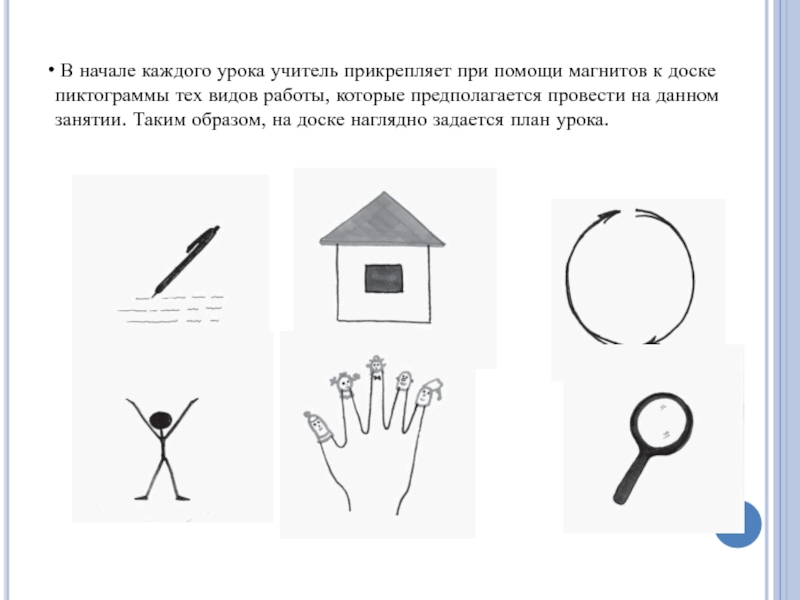 доске пиктограммы тех видов работы, которые предполагается провести на данном занятии. Таким образом, на доске наглядно задается план урока.
