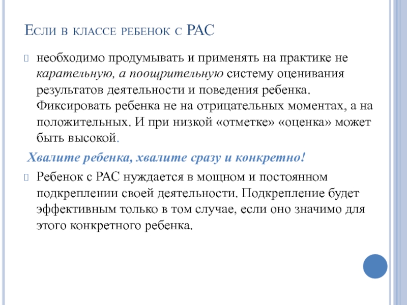 Ребенок с РАС нуждается в мощном и постоянном подкреплении своей деятельности. Подкрепление будет эффективным только в том случае, если оно значимо для этого конкретного ребенка.